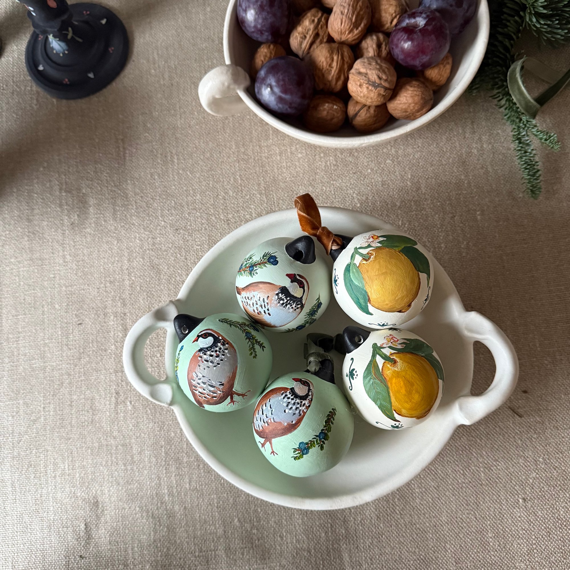 Hand pained decorations made from porcelain and hand painted using acrylic paint.
