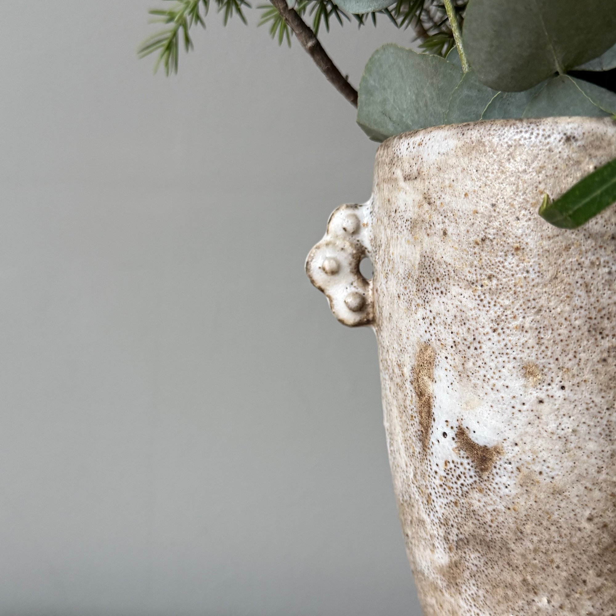 Thrown on the wheel in two parts. Once the clay has been trimmed to shape additions such as handles and decorations are added. The two parts are then jointed together