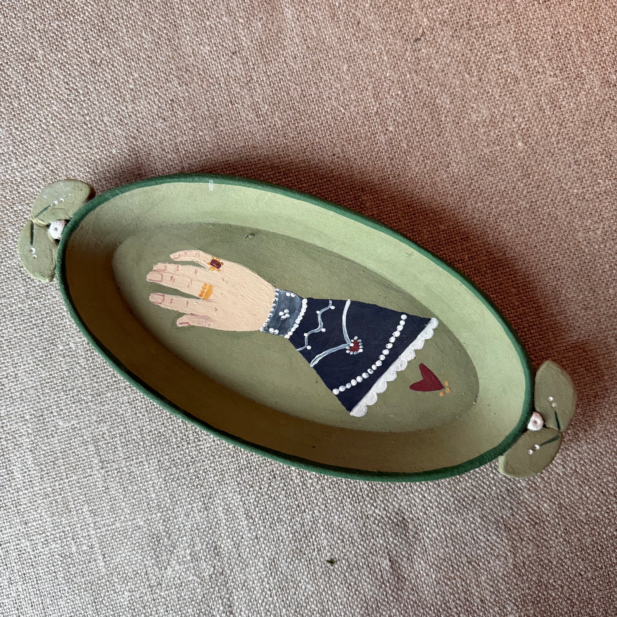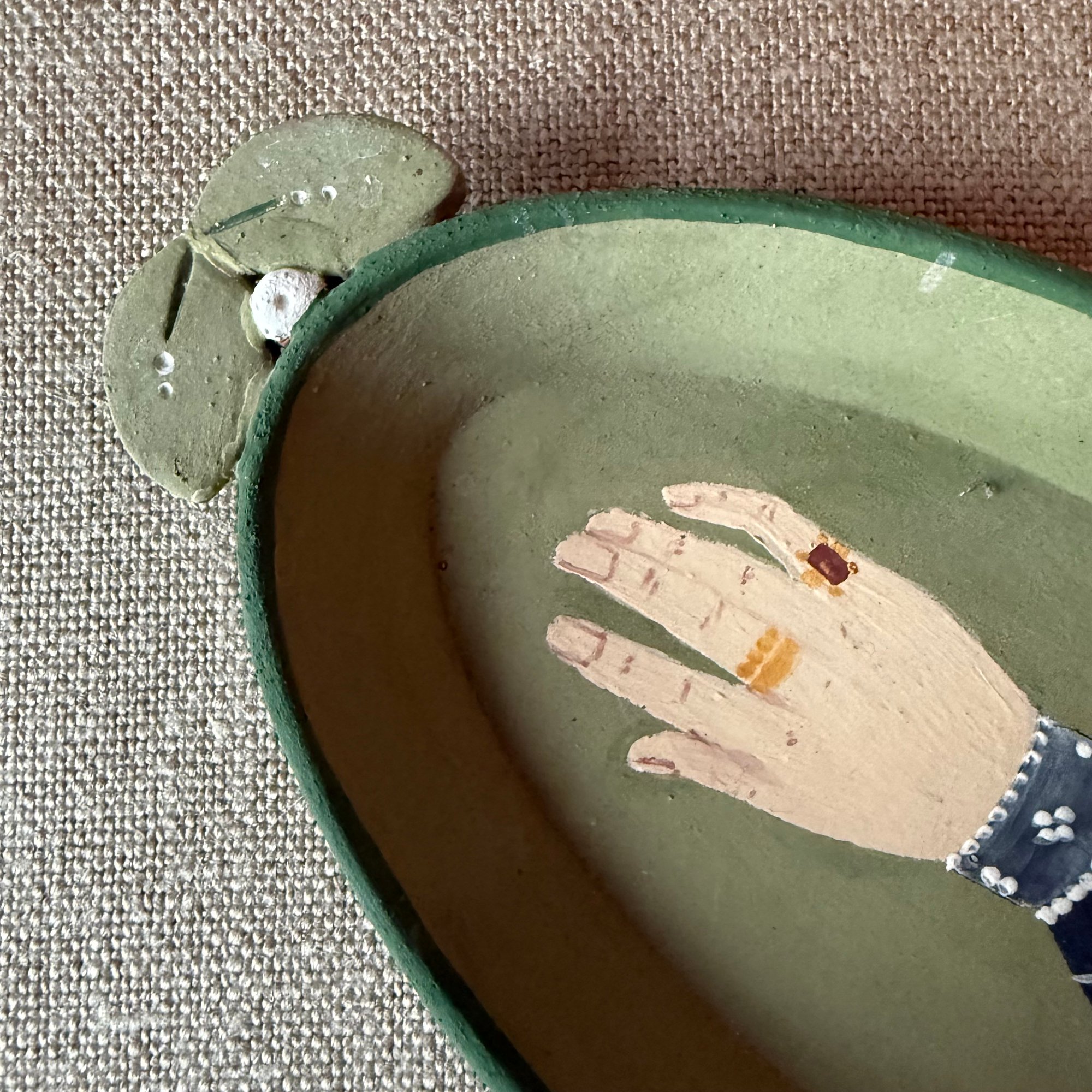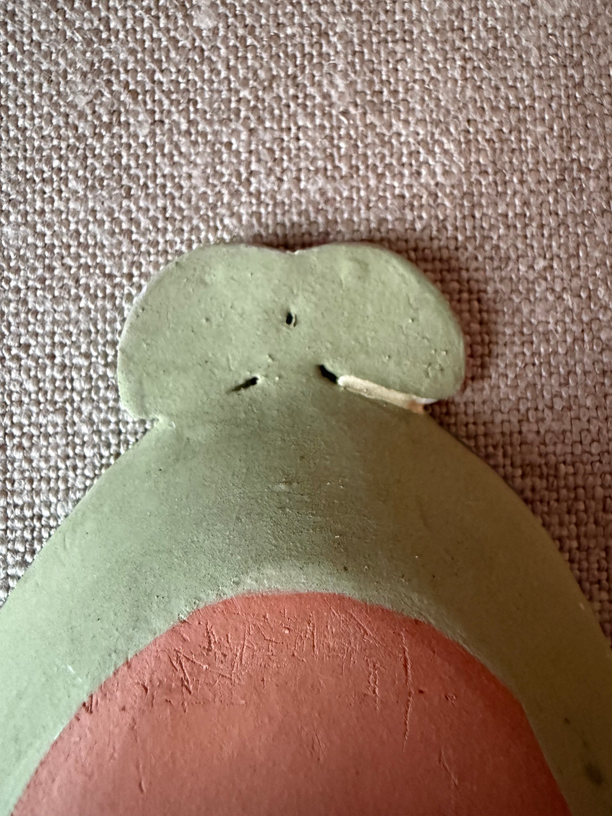 Illustrated mackerel plate. Made using pinching and coiling methods from terracotta clay and decorated with with underglaze.