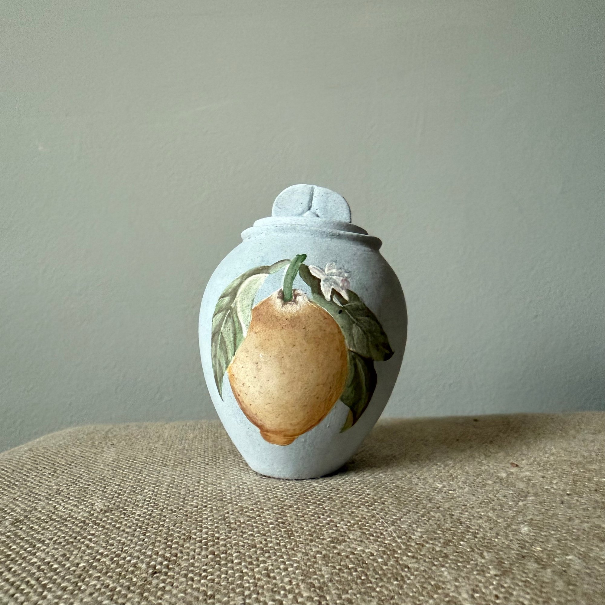 Medium illustrated jars made using coiling and pinching methods from terracotta clay and underglaze to illustrate. Glazed on the inside with a glossy transparent glaze