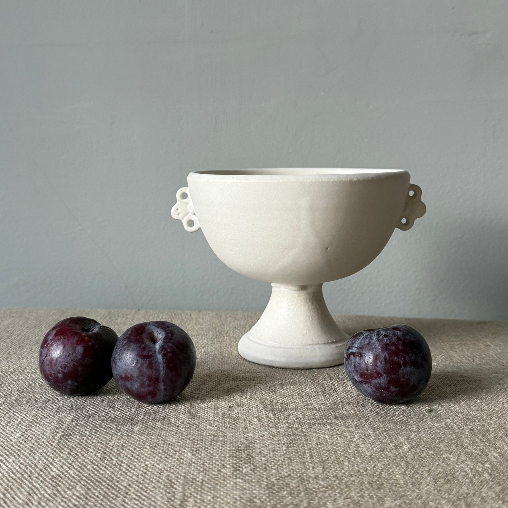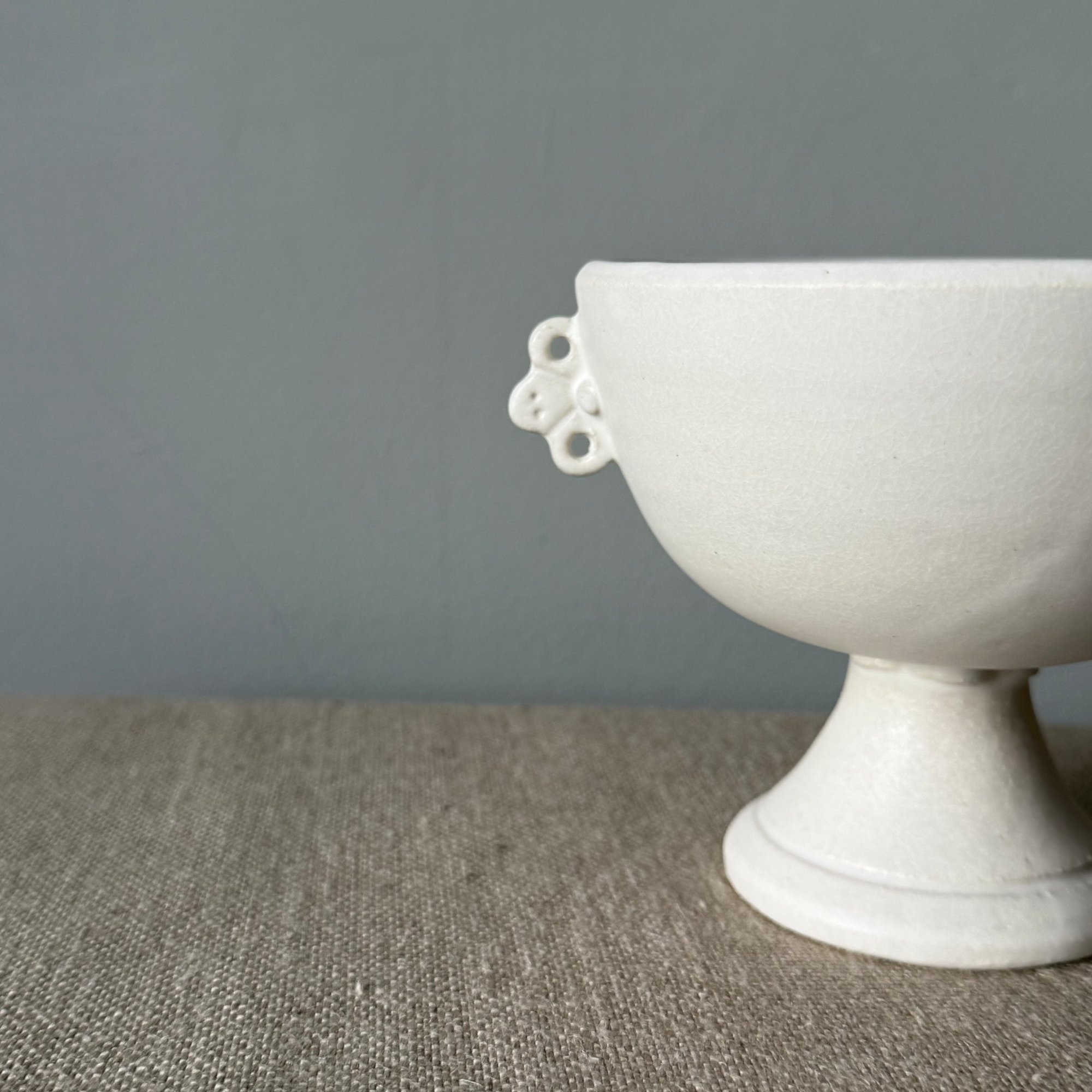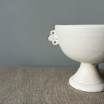 Thrown on the wheel in two parts. Once the clay has been trimmed to shape additions such as handles and decorations are added. The two parts are then jointed together